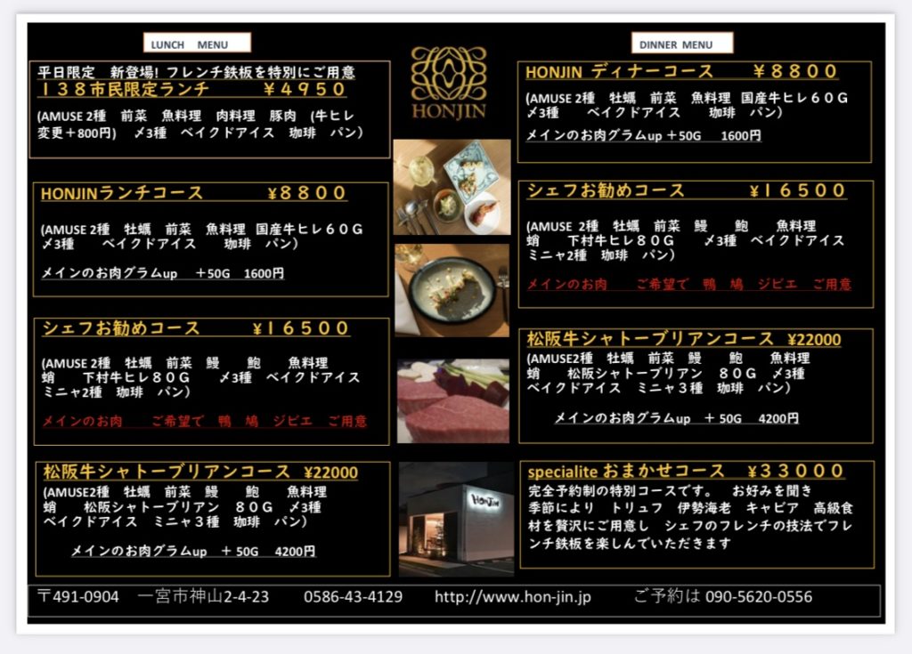 引き続きランチは従来の138市民限定鉄板コースより品数も増えた138市民限定フレンチ鉄板コースのご用意も!!! ディナーコースは市民以外のお客様にも利用できるリーズナブルなHONJINディナーコースも!!!